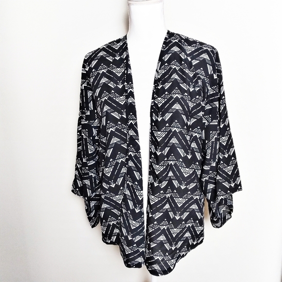 Black kimono with tribal print. Great layering piece with boho feel perfect for festivals. Excellent pre-owned condition: no holes, rips, tears or stains.