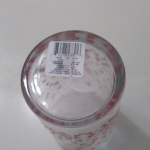 Pre-owned in very good condition. Red white heart pattern vase that is approximately 6 inches and 3.5 inch diameter.