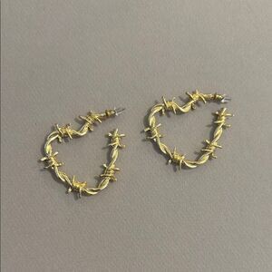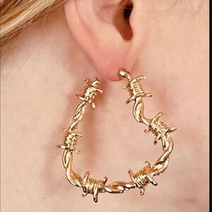 These striking gold and silver barbed wire hoop earrings add an edgy touch to any outfit. Perfect for making a bold statement.
