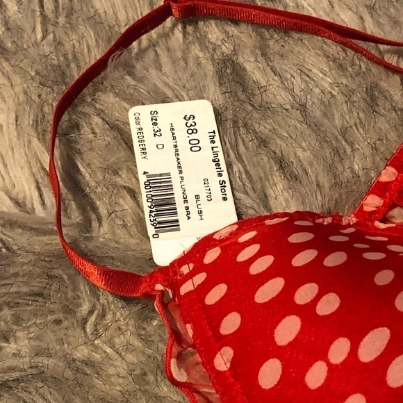 Sexy polka dot heartbreaker plunge bra by Blush in redberry, ruffle trim and cream flower accent. NWT.