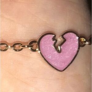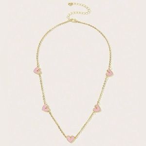 “Heartbroken” Heartsick Heartsore Shattered Fractured Broken Pink Heart Chain of Heart Shimmer Glimmer Sparkle Charms Anti-Valentine’s Day Feminine Romance Couple Anniversary Valentine’s Day Kawaii Gold Necklace. Equidistant dainty pastel shimmering pink broken/shattered hearts on a gold link chain. New.