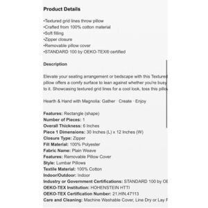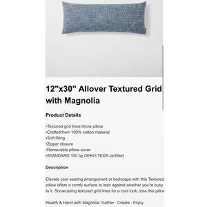 Hearth & Hand with Magnolia throw pillow. The 12"x30" pillow features a beautiful blue color and textured grid lines design. Perfect for adding a pop of color to any room, this lumbar throw pillow is sure to impress your guests. Made with high-quality materials, this pillow is both durable and comfortable to use. Ideal for those looking for a stylish and functional addition to their home decor.