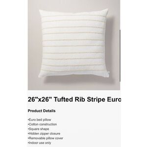 Add a touch of natural elegance to your home with this 26"x26" Tufted Rib Stripe Euro Bed Pillow. The creamy color and striped pattern give it a stylish look that will complement any decor. Made of 100% polyester fiber, this throw pillow is soft and comfortable to use. Its square shape and size make it perfect for both small and large spaces. Ideal for nature-themed rooms, this pillow is sure to be a cozy addition to your home.