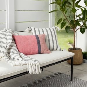 Made from a durable and UV-resistant fabric that protects it from the elements, this oblong outdoor pillow is generously filled to offer you comfy lumbar support while sitting, leaning or reclining. Featuring a classic woven design in a striking dark and light pink colorblock scheme that's separated by a single black stripe, this decorative lumbar pillow brings a touch of color to your open-air seating space.