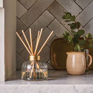 Stylish glass ribbed diffuser with gold top. Includes natural reeds for fragrance.