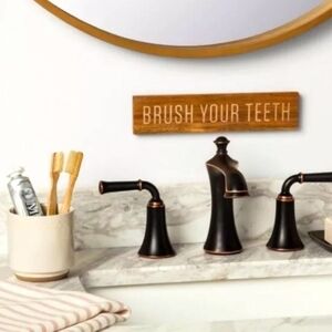 This Hearth & Hand with Magnolia wooden wall sign adds a cozy, farmhouse-inspired touch to your bathroom. Featuring the phrase “BRUSH YOUR TEETH” in bold white letters, this sign is crafted from warm-toned wood and is perfect for hanging above a sink or setting on a shelf