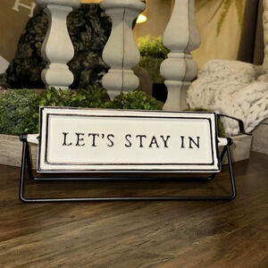Hearth & Hand with Magnolia Home Collection Chip & Joanna Gaines HGTV Home & Garden Television Network Interior Designers/Television Personalities Metal Table Reversible Black/White Farmhouse Sign on Turning Stand Home Accents & Decor/Accessories ‘Let’s Go Out’ / ‘Let’s Stay In’ Hard To Find Trending Sold Out Everywhere & No Longer Available ~