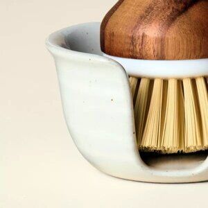 Glazed Cream Stoneware Sink Caddy & Nylon Scrub Brush with Acacia Wood Handle