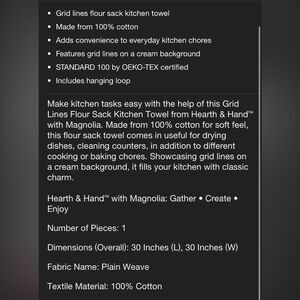 Hearth & Hand Grid Lines Kitchen Towel NWT Size is 30x30 Color is Grey with Cream Please see full description above in pictures