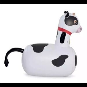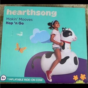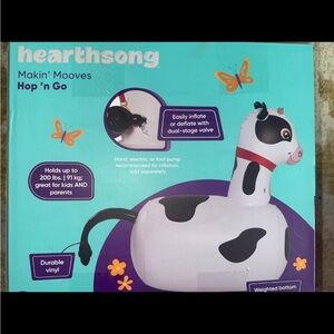This product is a soft play equipment cow made by HearthSong. It is collapsible and can be used indoors or outdoors. The recommended age range is 5 years and up, and it can hold up to 200 pounds. The material is PVC (polyvinyl chloride), and it can be spot or wipe cleaned.