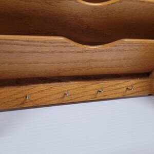 Vintage wood Hanging wall mounted mail holder/sorter. It measures approx 12'' x 12'' x 3'', has 3 compartments for holding mail, 4 hooks for keys and is in good pre owned condition.