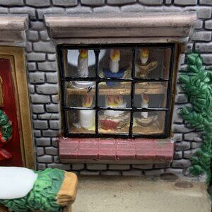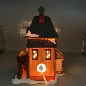 Made of porcelain, it is hand painted with lots of detail. It is a taller, two-story building with brick outside and tile looking roof. One side has a water wheel with a deck. You can see different styles of candles in the window. There is a red front door. Included is the 6' power cord with an on/off switch and lightbulb. The back of the candle shop has a hole for the lightbulb to fit into. When turned on, it lights up the windows. This shop measures 10" tall by 7" wide by 7" deep. This shop arrives in the original box with styrofoam packing.