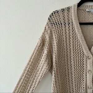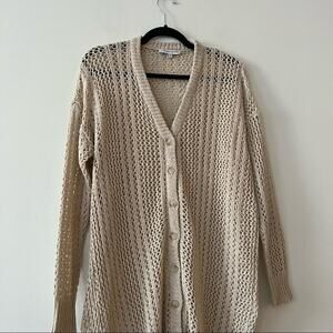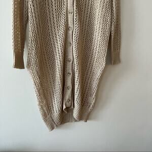 In good preowned condition. Beige knit cardigan with button down the front. Hits just above the knee.