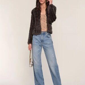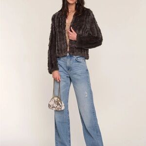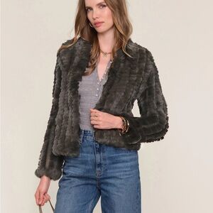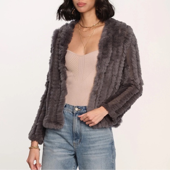 Soft grey faux fur shrug. Plush textured knit panels. Open front styling. Luxurious look and feel. Versatile layering piece.