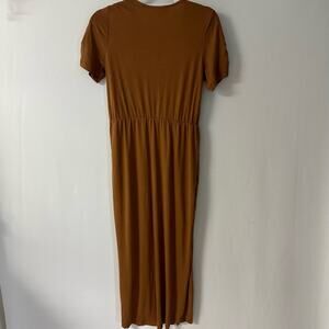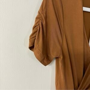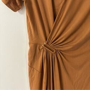 Chic tan maxi dress by Heartloom. Features a twist front and V-neck. Short sleeves add elegance.