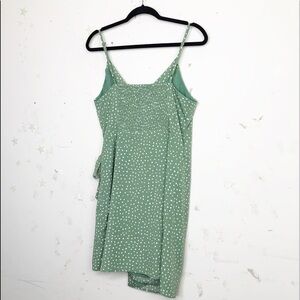 Heartloom olive green polkadot wrap dress, wraps and ties at the side with stretch elastic back and spaghetti straps adjustable 100% polyester.