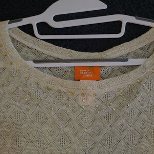 This Hearts of Palm women's top in light tan is a chic addition to any wardrobe. Made from a comfortable polyester blend, it's a petite medium size with a pullover style, short sleeves, and a sheer finish.