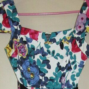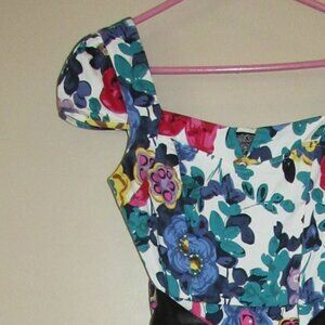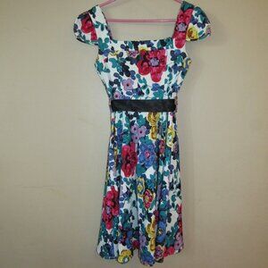 Hearts & Roses Floral Pin Up Dress Fit & Flare Retro Rockabilly Square Neck Sz 4. Black satin tie belt. Cute cap sleeves. Side zipper. Full twirly skirt!