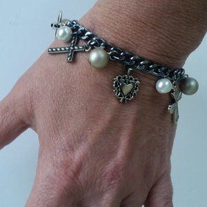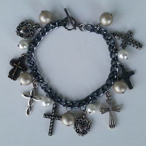 Hearts and Crosses Charm Bracelet Silvertone with Faux Pearls New Hand Crafted