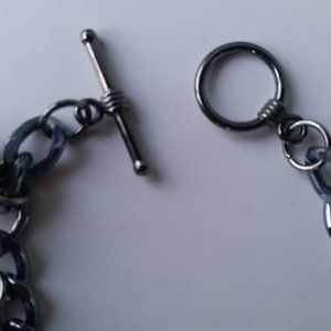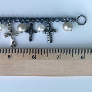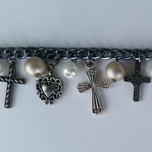 Fashion jewelry charm bracelet measures 8" in length with a Bar fastener. Thick chain is blackened silvertone and hearts and crosses are blackened. Large cream colored faux pearls and smaller white pearls are mingled in between charms. This is a NEW handcrafted item. Comes with gift box.