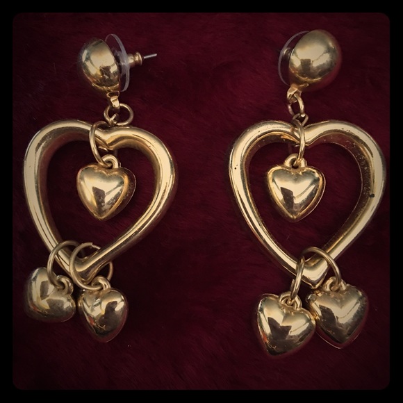 These are vintage goldtone hearts in hearts dangle earrings in good condition. Good size but lightweight and do not weight your ear lopes down. Just need a little cleaning to shine.
