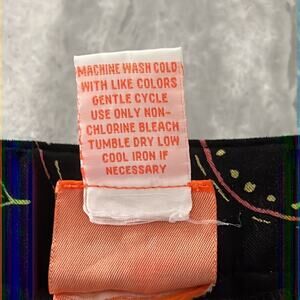 Black with pink and green paisley and floral print pants in a soft polyester/spandex blend faux suede fabric straight wide legs, button waistband and zipper fly closure, small front pocket and back trouser pocket