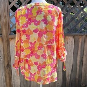 This is a beautiful top from Hearts of Palm with three buttons in the front and roll up button option on the sleeves. Please note one sleeve is missing the tiny golden button. Another can be easily added or you can choose not to roll up the sleeves.