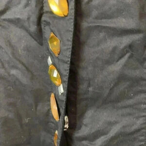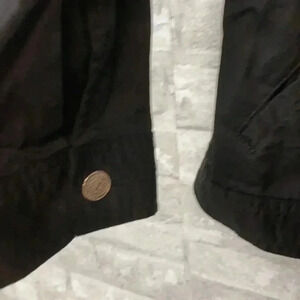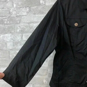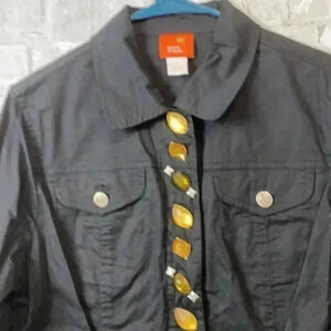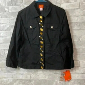 NWT Cotton spandex stretch jacket -3/4 inch snap closure. Bling covering snaps. Two top front pockets. One button closure sleeve. Laying flat pit to pit 20” -shoulder to hem 21 1/2” - sleeve 19 1/2”. Preowned condition please check all photos for details.