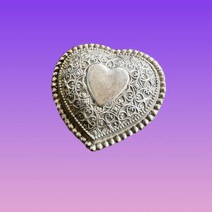 Pewter heart-shaped trinket box, blue velvet lining. Approximately 3" across and 1 1/2" tall.
