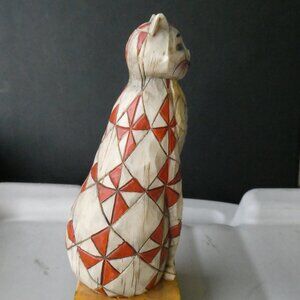 7” tall Carved patchwork cat with metal tail