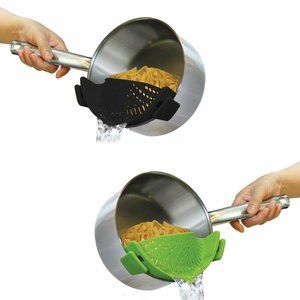 Strain all your favorite foods without dropping odd bits into the sink and splashing boiling water everywhere. The Snap 'n Strain kitchen Strainer is the easiest, most efficient and practical pot strainer that clips on to any type of cookware. Simply clip the pasta pot strainer onto any pot and tilt over the sink or a bowl to strain out the liquid contents. Secure clips will make sure that the strainer doesn’t slip off while you strain the liquid. Use for vegetables, potatoes, eggs, grains, pasta etc.