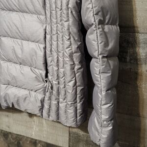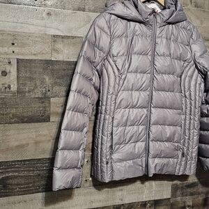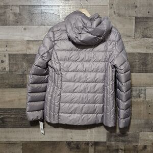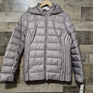 Stylish gray down jacket with 650 fill power. Features a packable design and removable hood.
