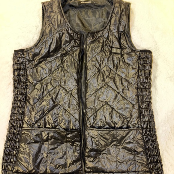 This sleek HEATED black vest features a distinctive diamond-shaped quilting pattern on the front. Made from a shiny, water-resistant material, it offers both style and practicality with its full-length zipper.