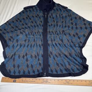 Heather B Poncho Womens Lg Wool Blend Blue Gray Full Zip Knit Sweater Cape EUC