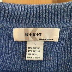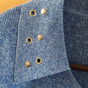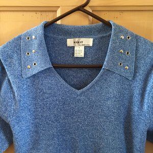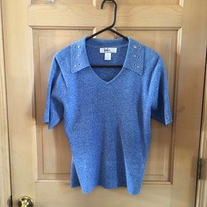 V-neck sweater from Kikit. Heather blue, short sleeve, gold studs on collar. Size Large.