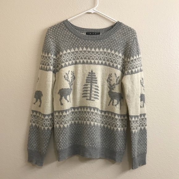 Cute and versatile Holiday sweater, perfect for casual wear around the Holidays. Has reindeer and trees along the body. Colors are heather grey and cream. Some light pilling/fuzziness around the sweater but can be removed with a lint/sweater shaver. No holes or stains, just slight pilling. Size small but roomy enough for a medium as well. Crew neck. 100% acrylic. Purchased from a local boutique similar to Urban Outfitters.