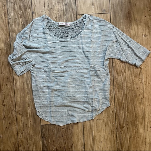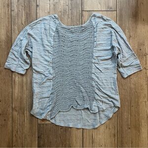 Lightweight, soft fabric with a knit detail on the back. Tag is cut out, but fits like a cropped (hits at waist) medium.