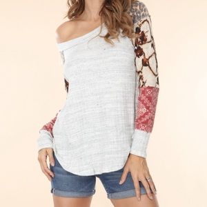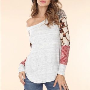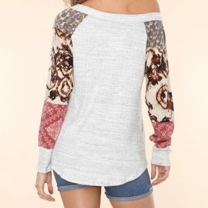 Heather gray raglan style tunic top. Multi print block sleeve, scoop/off shoulder neckline, lightweight, breathable, relax fit. Made in the USA.