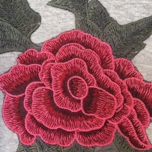 Adorable off shoulder top with long sleeves and embroidered roses. Relaxed fit. Content: 95% cotton/5% spandex.