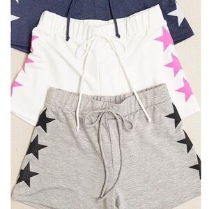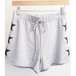 Heather gray lightweight sweatshirt material side star printed Knit Shorts. Absolutely adorable. The perfect pair of shorts too. They don’t have the hot fuzzy sweatshirt material on the inside but they feel that consistency on the outside. Good quality. Matching short sleeve sweatshirt top listed separately. Stars printed on side of shorts in black. Drawstring, no pockets though.