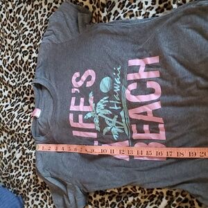 This short sleeve tee showcases a stylish heather gray color adorned with a bold 'LIFE'S A BEACH' graphic in light pink and blue The design features a cursive 'Hawaii' detail, adding a unique touch to this casual top. Made from a comfortable cotton blend, it's ideal for relaxed outings.