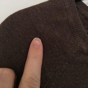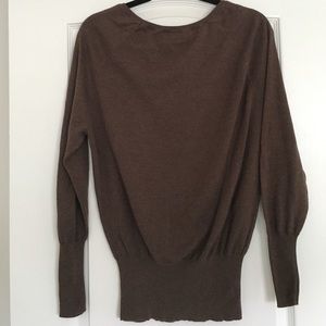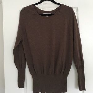 Heather brown long sleeve knit top. Dolman sleeve. 60% cotton/30% polyester/10%rayon. Banding at sleeve and bottom hem. Small snag on right shoulder, shown in photo.
