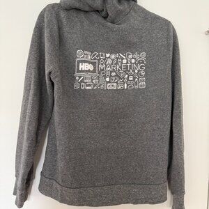 Heather gray alternative apparel zip up hoodie with HBO Marketing logo on back.