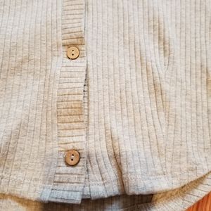 This ribbed gray top features cropped style, vee neck with collar, comfort stretch, long sleeves, 3-button front and curved hem.