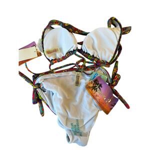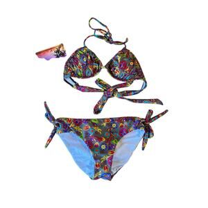 Heaven Bikini Set Black Multi Floral Booster Triangle Bra Side Tie Bottom Size 8