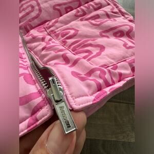 Sleeveless insulated taffeta vest in pink featuring tonal graphic pattern printed throughout. Funnel neck collar. Zip closure at front. Patch pockets at waist. Featuring artwork by Julian Consuegra. Part of the Heaven by Marc Jacobs capsule collection.