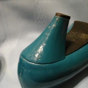 Heavenly Comfort Vintage Teal Woman's Pumps with Layered Ruffle Design Size 6 Very Glossy! Small marks on back of heel and wear on bottom. See pictures.