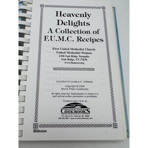 A collection of recipes from the First United Methodist Church in Oak Ridge, Tennessee, published in 2008. Perfect for collectors and cooking enthusiasts alike. The cookbook measures 8.75" x 6", is spiral-bound hardback, and has 200 numbered pages.