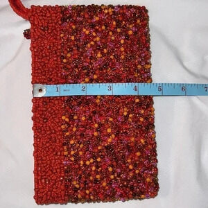 Heavily beaded in orange, gold, pink evening bag purse wristlet in EXCELLENT condition inside and outside. Beaded handle and round accent on zipper tab. No stains or missing beads. Perfect for any occasion, year round!