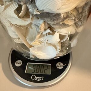 This listing is for one heavy glass assorted seashell jar. This is so pretty and I handpicked it to sell. The glass jar with the sea shells weighs 5.80 lbs so it will go into additional shipping once packaged up and ready to send. This heavy jar does not have a lid. Enhance your home with this elegant decorative jar filled with assorted seashells. The white and cream tones add a touch of coastal charm to any room. All props in photos are for display only. Measures approximately 7 3/4” tall by 6 3/4” diameter opening of jar. Please refer to all photos and ask any questions that you may have. All props in photos are for display only.
